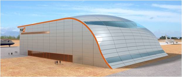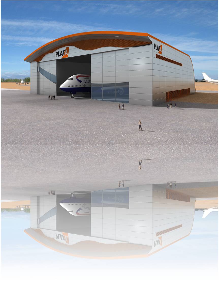 Se facilita la coexistencia de los distintos usos, agrupando las zonas de servicio lo que supone, además, una mayor sencillez en la distribución de las instalaciones básicas. Con este fin, se propone el diseño de una planta con forma ligeramente trapezoidal, que agrupa la zona de servicios o apoyo al mantenimiento enfrentada a la puerta de acceso de la aeronave, quedando los laterales para el uso de carga y descarga, organizando así el edificio de forma lógica.